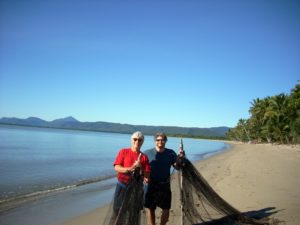 We had tied the poles to our waists, following the instructions of Lyle and Gloria, two Aussies vacationing at the caravan park who suggested we go prawning and who provided the net. We walked backwards out of the water to the shore.